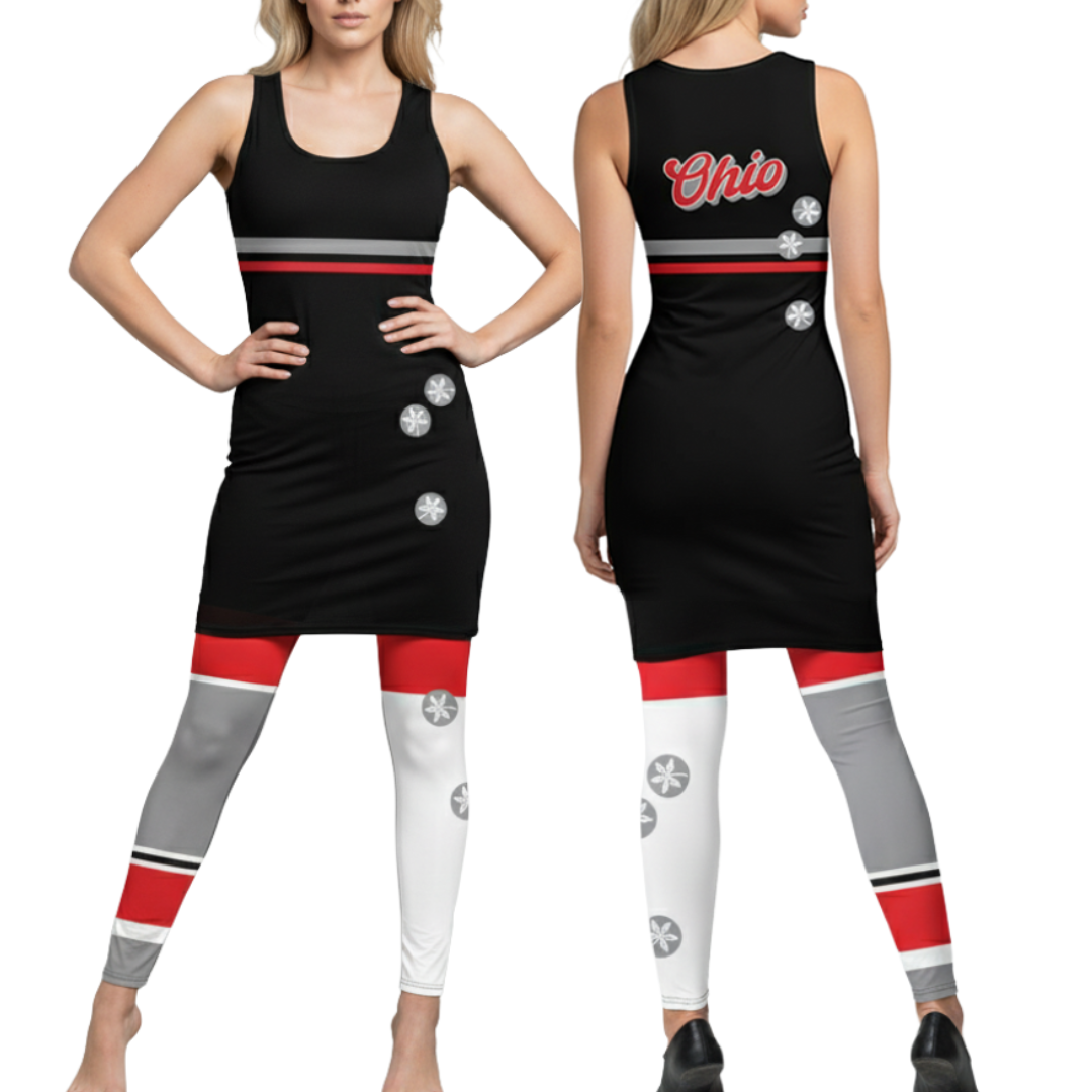 Show your OSU pride with a modern fan favorite dress. A slimming scarlet and grey band under the bust flatters your shape against a sleek black base, while the “Ohio” script on the back and OSU stickers on one side showcase bold team spirit. Made from a super-soft, stretchy microfiber blend with four-way stretch, it moves with you from game day celebrations to nights out, delivering comfort and a great fit every time.