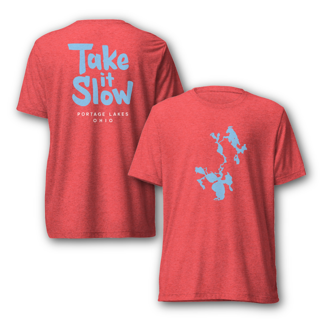 DESIGN: Front: A map illustration of the Portage Lakes. Back: The words "Take it Slow" in a bold and fun font. A simple reminder to enjoy the relaxed pace of Portage Lakes.