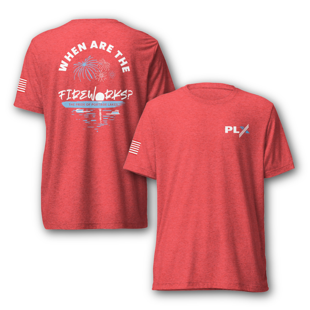 DESIGN: Front: American-themed PLX design. Back: "When are the fireworks?" with a fun illustration of fireworks over the lake. The question everyone asks us all summer long! Sleeve: American Flag